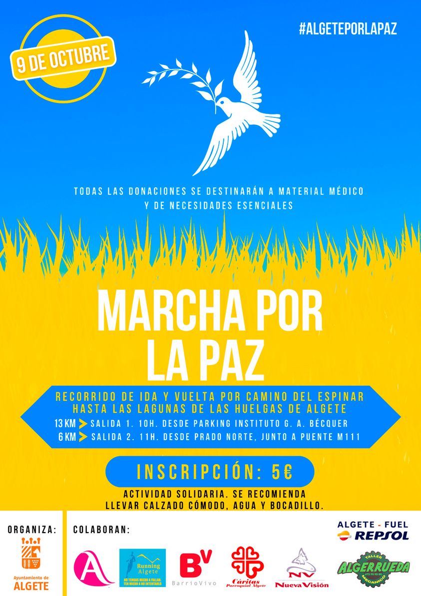¡Recuerda que este domingo 9 de octubre tienes una cita! Un gran plan en la naturaleza, en buena compañía y por una buena causa. ¡Ven a la marcha por la paz! Así colaborarás con la ONG Unimos Corazones UC, mientras conoces las fincas naturales algeteñas. La inscripción a la marcha son 5€ que podrás abonar al recoger tu dorsal en una de los puntos de salida habilitados: Parking del Instituto G.A. Bécquer o Prado Norte, junto al puente que cruza la M111.